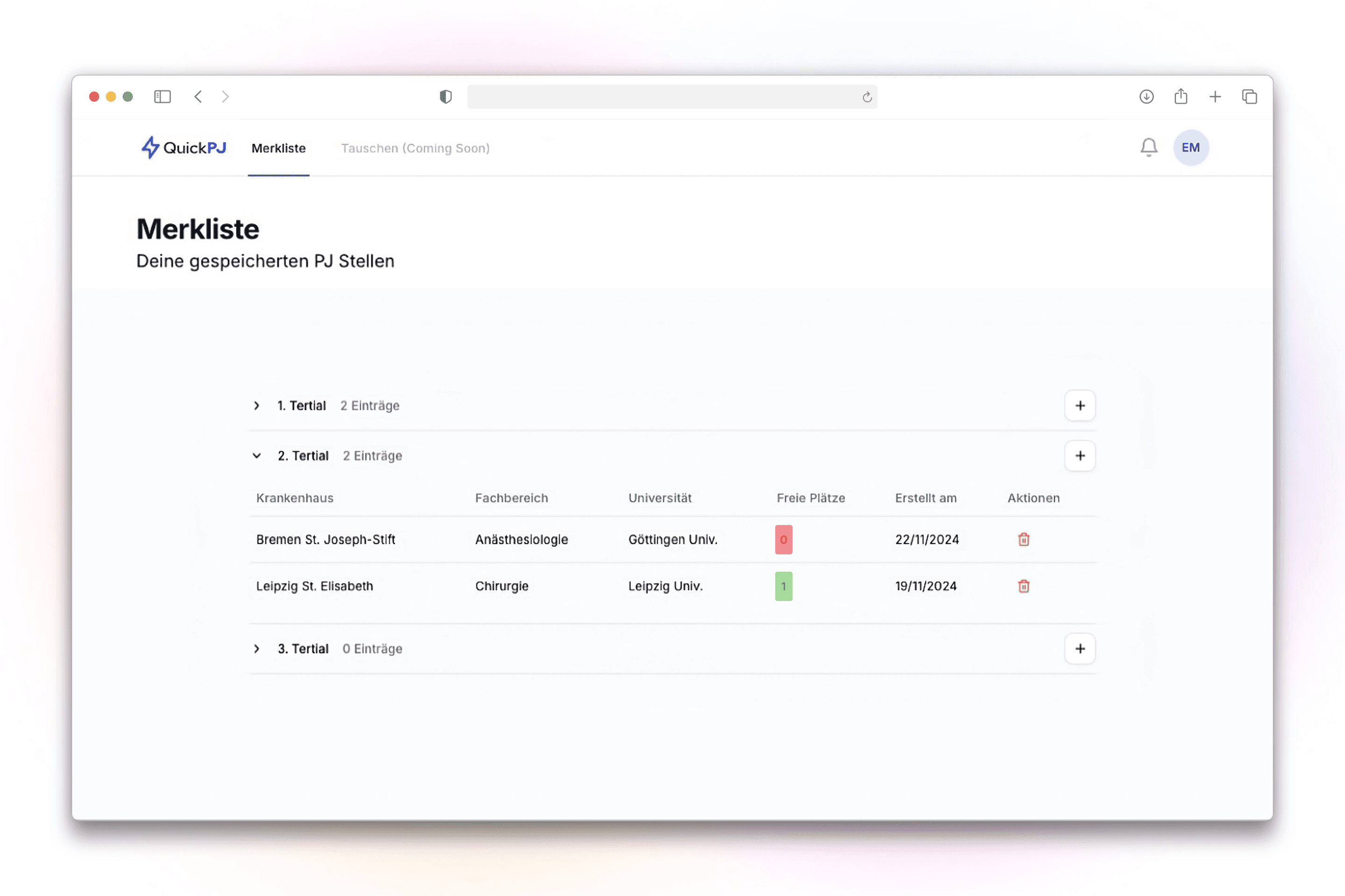Erstelle aus allen PJ-Plätzen deine individuelle Merkliste oder importiere sie direkt aus dem PJ-Portal.